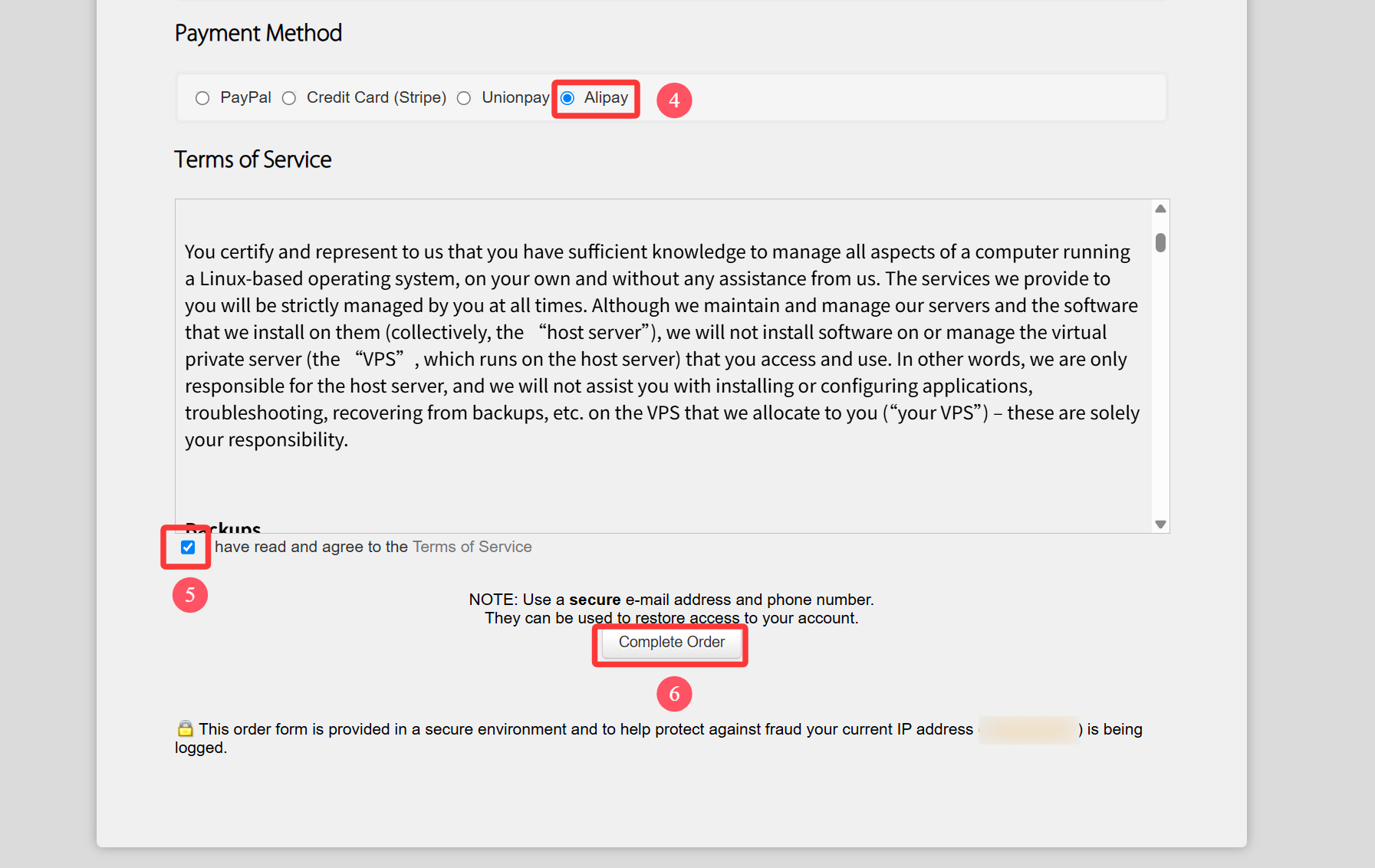 可以参照以下格式(邮箱填自己的),最后选择支付方式为Alipay(支付宝),勾选用户协议,点完成订单。