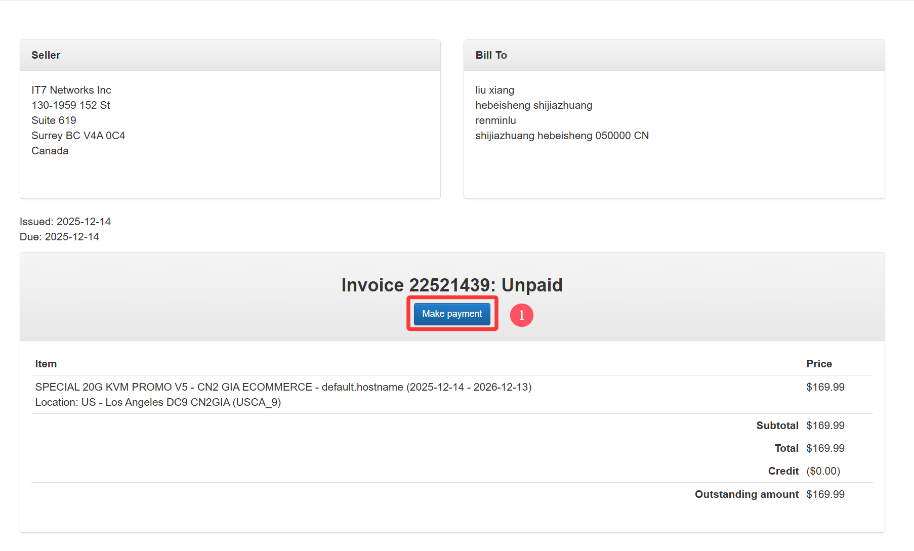 这里会让你确认买家信息、账单信息和产品信息,确认无误后点击Make payment即可。
