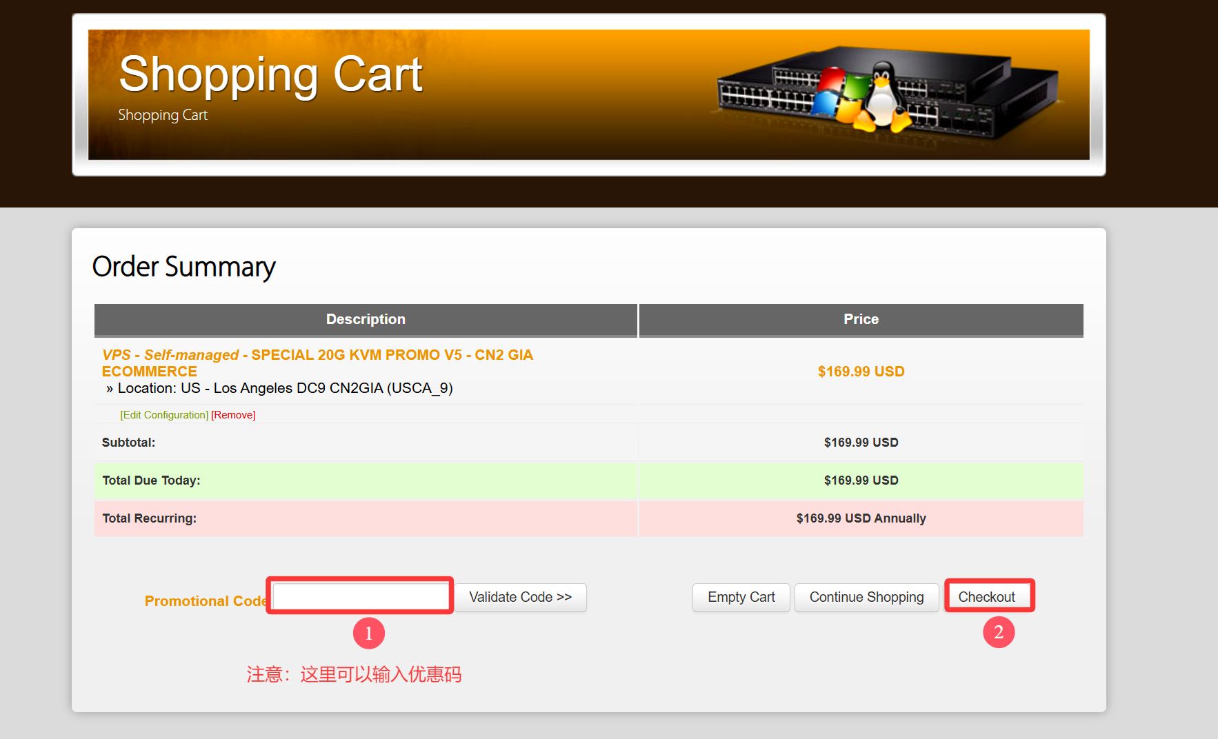 目前常规E-Commerce和E-Commerce SLA款没有优惠码,直接点Checkout确认即可。